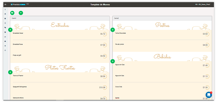 El software te permite manejar el diseño de tu menú desde cualquier lugar. El menú puede tener combos, pedidos adicionales, anotaciones y opciones. Adicionalmente, cuando tienes varios locales, puedes desde tu browser web cambiar el menú de todos los locales simultáneamente, sin necesidad de visitarlos. La aplicación te permite también crear nuevos botones para productos y cambiar precios. En cuestión de segundos, todos los menús y listas de precios de tus locales pueden estar actualizados.