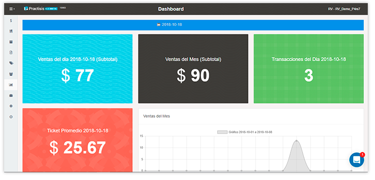 Cada vez que abres Practisis, la plataforma te recibe con tu dashboard. Esta pantalla te muestra tu operación, las ventas, tenedor promedio, entre otras estadísticas interesantes. Con el dashboard puedes ahorrar tiempo para entender rápidamente cómo va tu negocio.