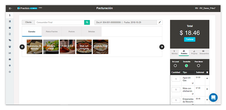 Practisis cuenta con un sistema de pedidos a domicilio que te permite hacerlos para varios locales y despachar el pedido al local más cercano para facturar y enviar. Cuenta además, con memoria de direcciones, teléfono y un menú web.