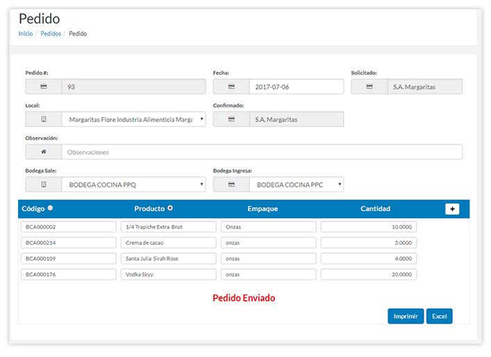 Con el sistema de pedidos, cada local o franquicia puede solicitar a la planta central el despacho de materia prima para su operación.