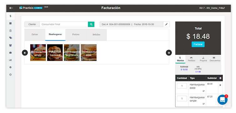 Con un menú visual sencillo, Practisis permite a los cajeros crear facturas en segundos. Con tecnología ePOS para impresión, la creación de comandas, facturas o recibos es instantánea y no vas a notar ningún retraso en la generación de documentos para el cliente. Adicionalmente, la curva de aprendizaje para nuevos cajeros es tan baja que equivale al tiempo que se tomen en aprenderse el menú de tu establecimiento.