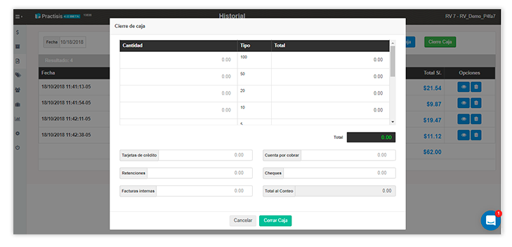 El cierre de caja seguro de Practisis te permite controlar la recaudación completa de cada punto de venta y cajero con precisión. Con la capacidad de detallar todas las transacciones, conciliación de valores, sumas por tipo de pago y arqueo, con Practisis el control de caja es eficiente y seguro.