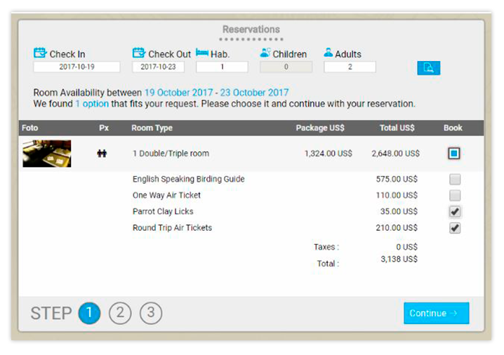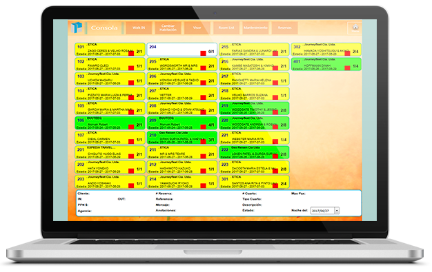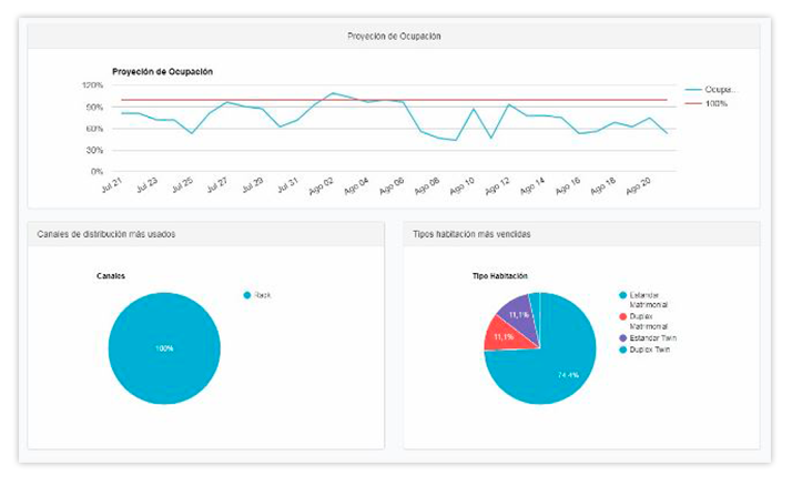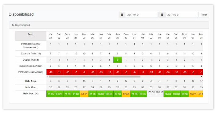 Maneja toda tu disponibilidad e inventario de habitaciones desde una consola de reservas visual. El sistema de reservas te permite en una sola pantalla manejar toda tu disponibilidad y controlar el estado de cada reserva: Desde un requerimiento de reserva, hasta confirmación, bloqueo, waiting list o cancelación. Visualiza las reservas en lista o en detalle. Adicionalmente el sistema te permite visualizar tus reservas por tipo en un formato tipo chart o en un gráfico de ocupación.