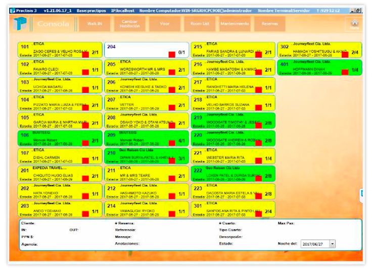 El Roomlist en Practisis permite al personal de reservas, front desk o auditoria nocturna revisar fácilmente el estado actual de las habitaciones.