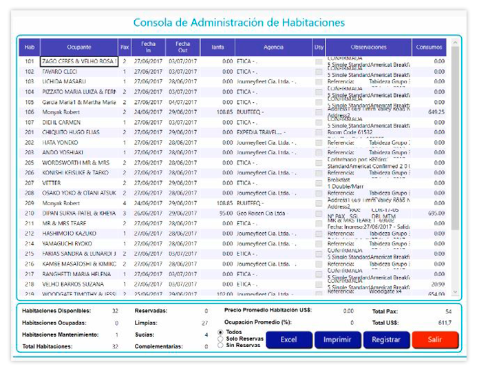 Adicionalmente con la opción de exportar la información a excel o imprimir el Roomlist, se puede trabajar con personal de limpieza o mantenimiento para el manejo del hotel.