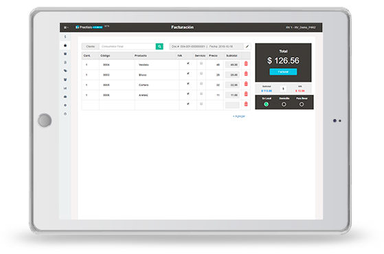 Crea tus facturas rápidamente desde un punto de venta en tu PC, tablet o directamente en la nube. Sin mucha capacitación, con las interfaces amigables de Practisis puedes trabajar rápidamente y poner en orden tus facturas. Practisis está diseñado para que la curva de aprendizaje de los operadores/cajeros sea de minutos.