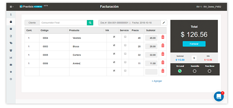 Herramienta cloud completa de operación, control, administración y supervisión de negocios de comercio minorista, retail y shops. Esta versión se caracteriza por su facilidad de facturación de alto volumen en transacciones, ideal para el comercio minorista.