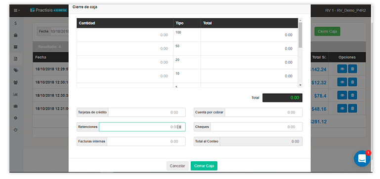 El cierre de caja seguro de Practisis te permite controlar la recaudación completa de cada punto de ventas y cajero con precisión. Con la capacidad de detallar todas las transacciones, conciliación de valores, sumas por tipo de pago y arqueo, el control de caja es eficiente y seguro con Practisis.